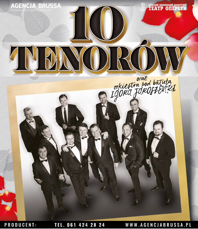 Trasa koncertowa 10 utalentowanych wokalistów gwarantuje pasję i uśmiech na twarzy. Najbardziej ekscytująca grupa wokalna 10 TENORÓW zaśpiewa dosłownie wszystko – od najlepszych piosenek romantyczny pop, ballad rockowych po utwory ludowe aż do arii operowej. Nic dziwnego - jest ich aż DZIESIĘCIU, więc i repertuar szeroki i możliwości znaczące. Ale to przecież nie jest cała prawda o 10 Tenorach z Polski i Ukrainy - ważnym elementem jest perfekcja z jaką wykonują muzykę, oraz skala talentu, który pozwala na sięganie równocześnie do twórczości Johanna Straussa i Leonarda Cohena.