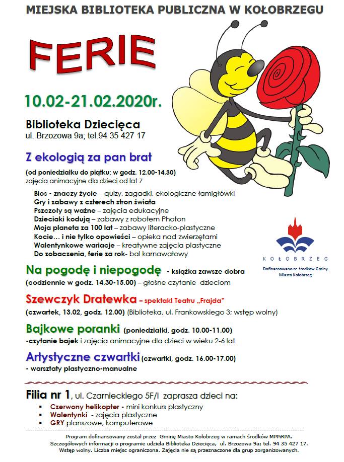 Rozpoczynamy wielkie odliczanie do ferii zimowych. Tegorocznym motywem zajęć animacyjnych dla dzieci odbywających się w Bibliotece Dziecięcej przy ul. Brzozowej 9a będzie ekologia. Zapraszamy od poniedziałku do piątku.