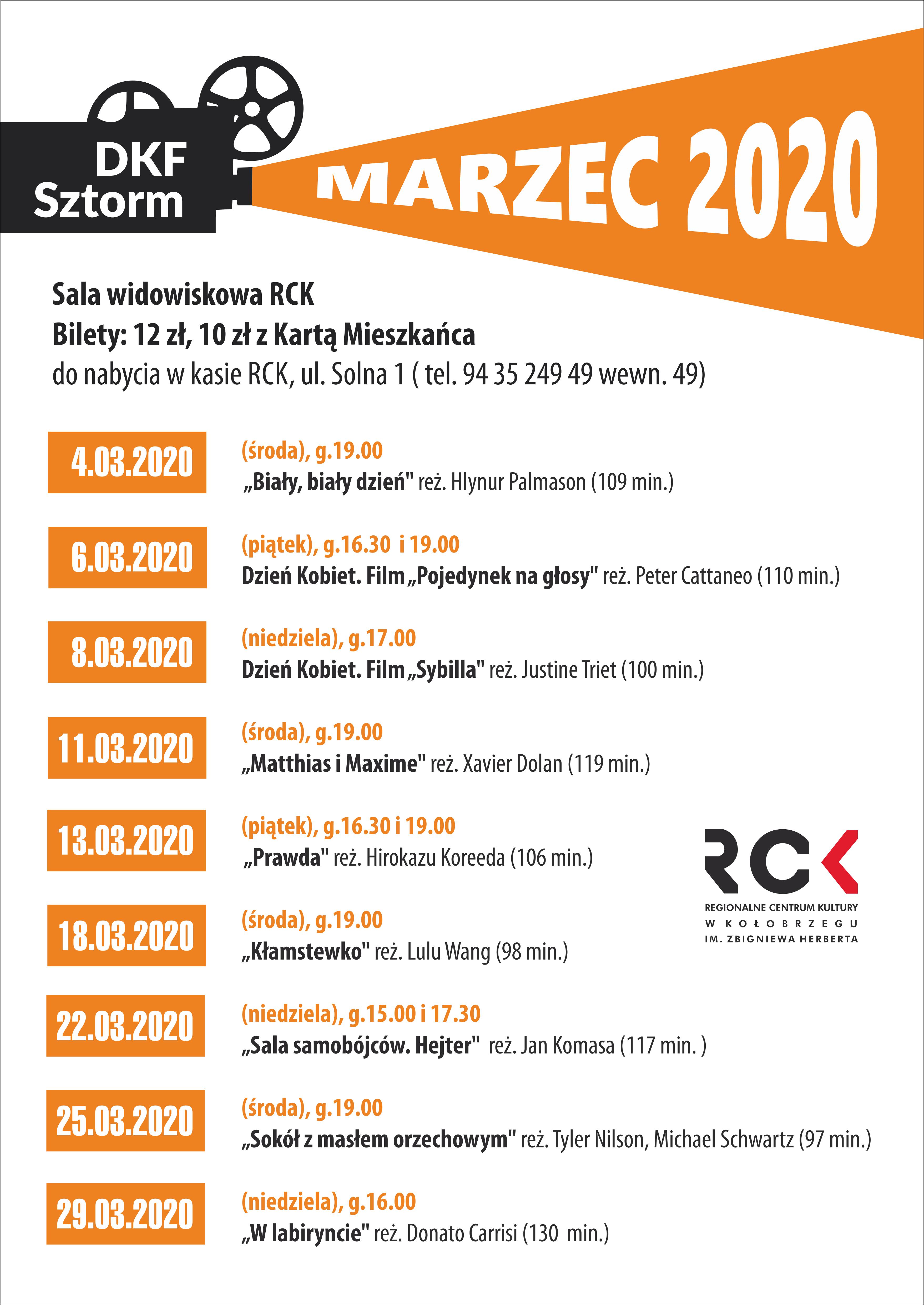 29.03.2020 (niedziela), g 16:00     DKF SZTORM W labiryncie, reż. Donato Carrisi,  130  min.  Bilety: 12 zł, 10 zł ulgowe i Karta Mieszkańca, sala widowiskowa