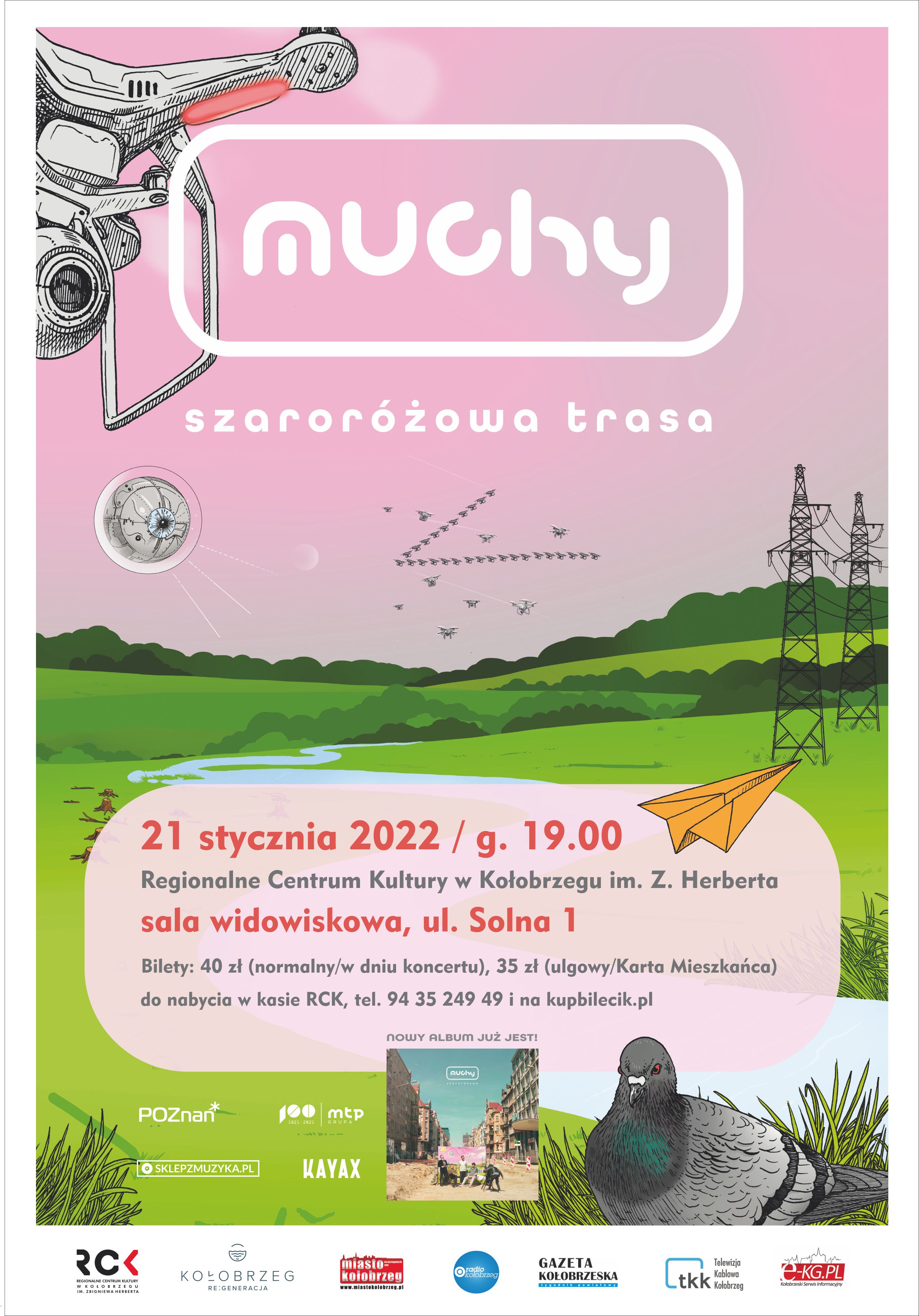 Zapraszamy 21.01.2022 r. o godzinie 19.00 do Regionalnego Centrum Kultury w Kołobrzegu im. Z. Herberta na koncert zespołu Muchy, który odbędzie się na sali widowiskowej RCK.