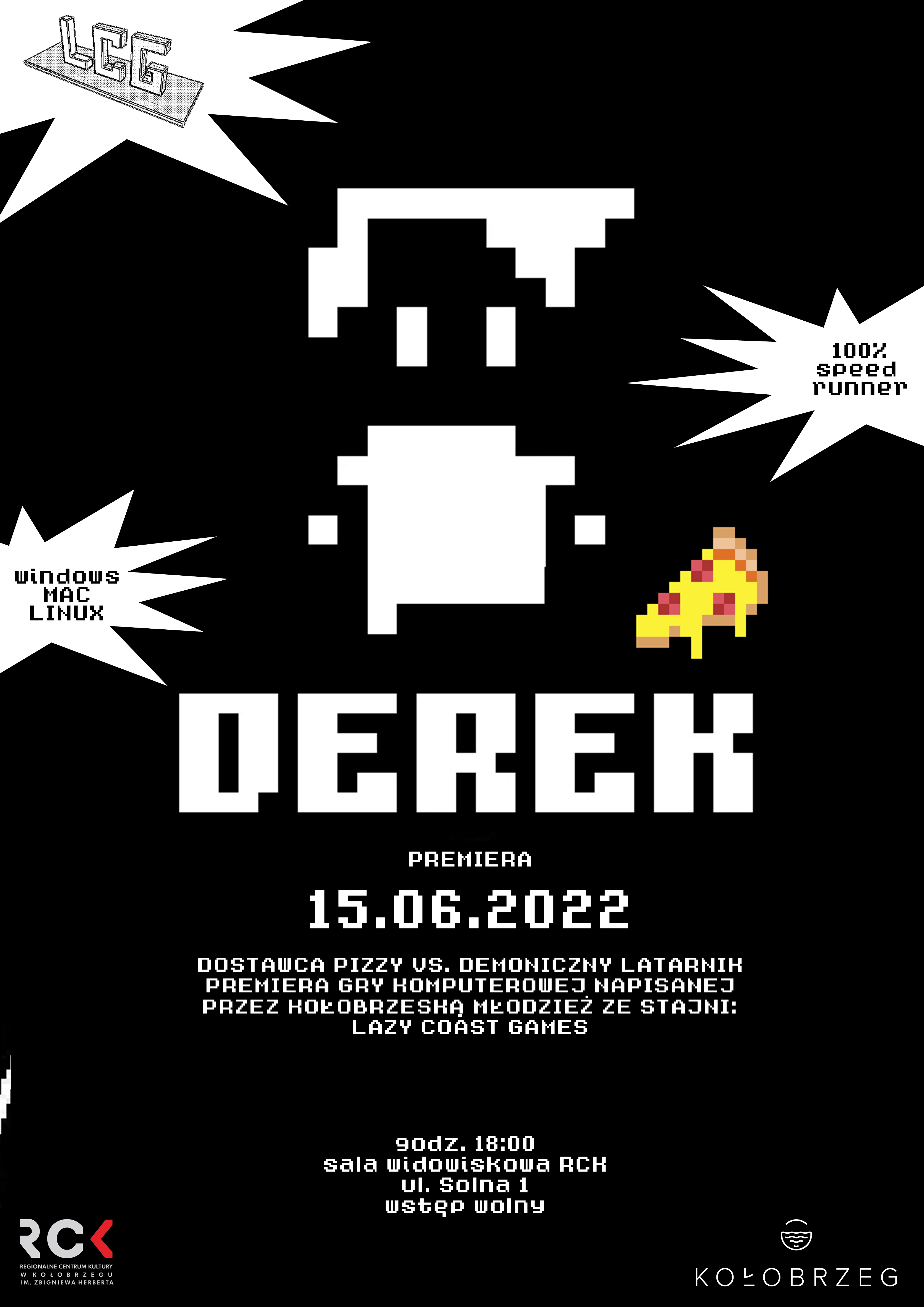 Gra komputerowa DEREK powstała podczas warsztatów multimedialnych realizowanych w RCK  w mijającym roku szkolnym. W zajęciach uczestniczyli uczniowie kołobrzeskich szkół w wieku 12-16 lat, łącznie 15 osób, którzy stworzyli grupę Lazy Coast Games. Warsztatami kierował Adam Frankiewicz.