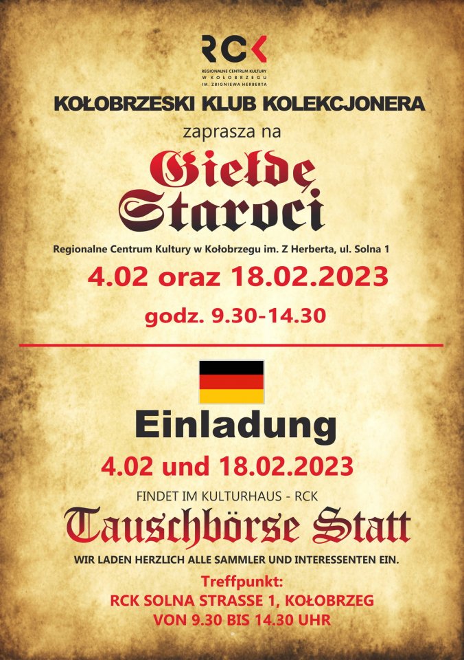Zapraszamy 04.02.2023 od godziny 9.30 na Giełdę Staroci, która odbędzie się na holu RCK.