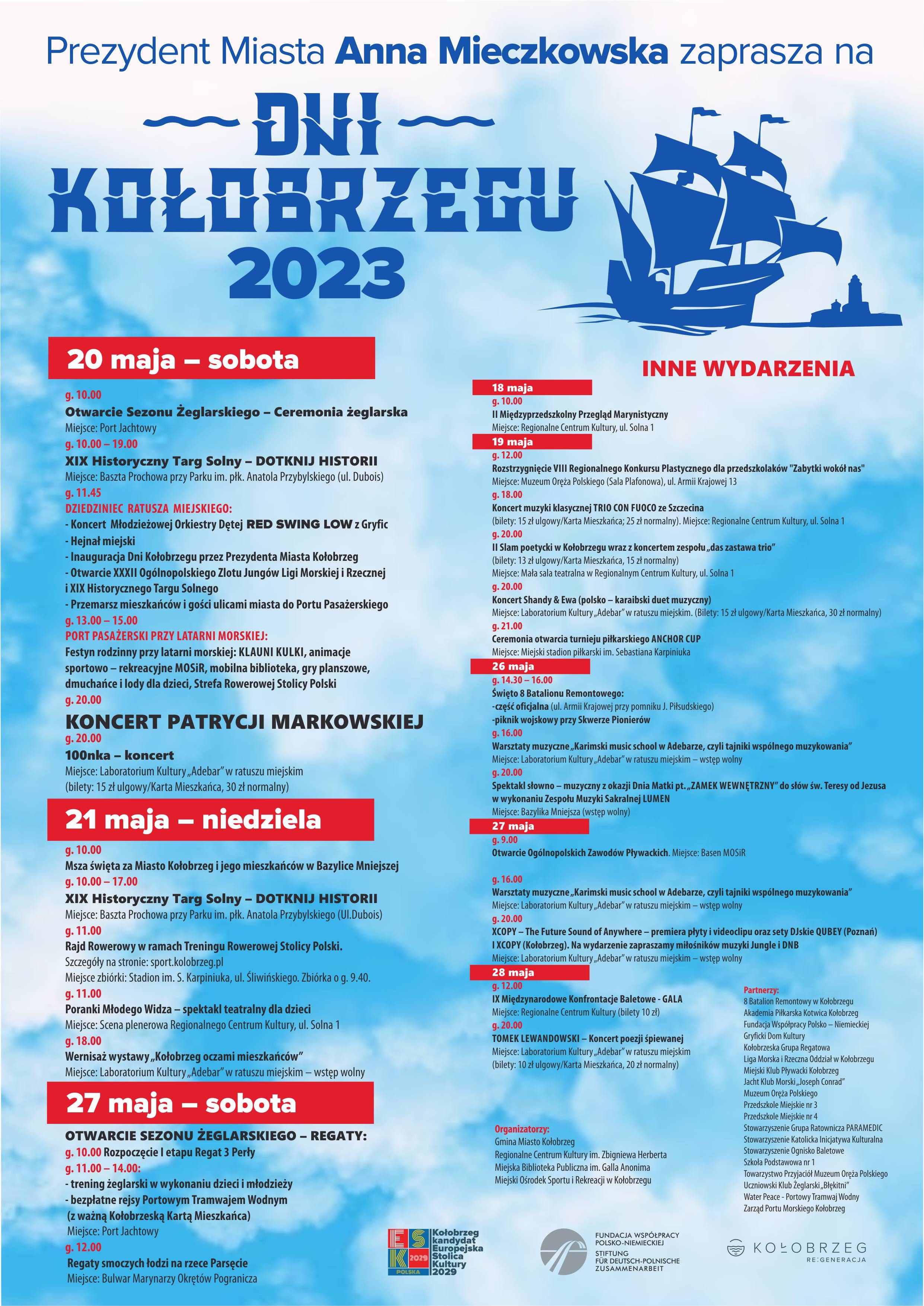 Zapraszamy do zapoznania się z programem obchodów DNI KOŁOBRZEGU 2023, które odbędą się w dniach 20-28.05.2023 r.