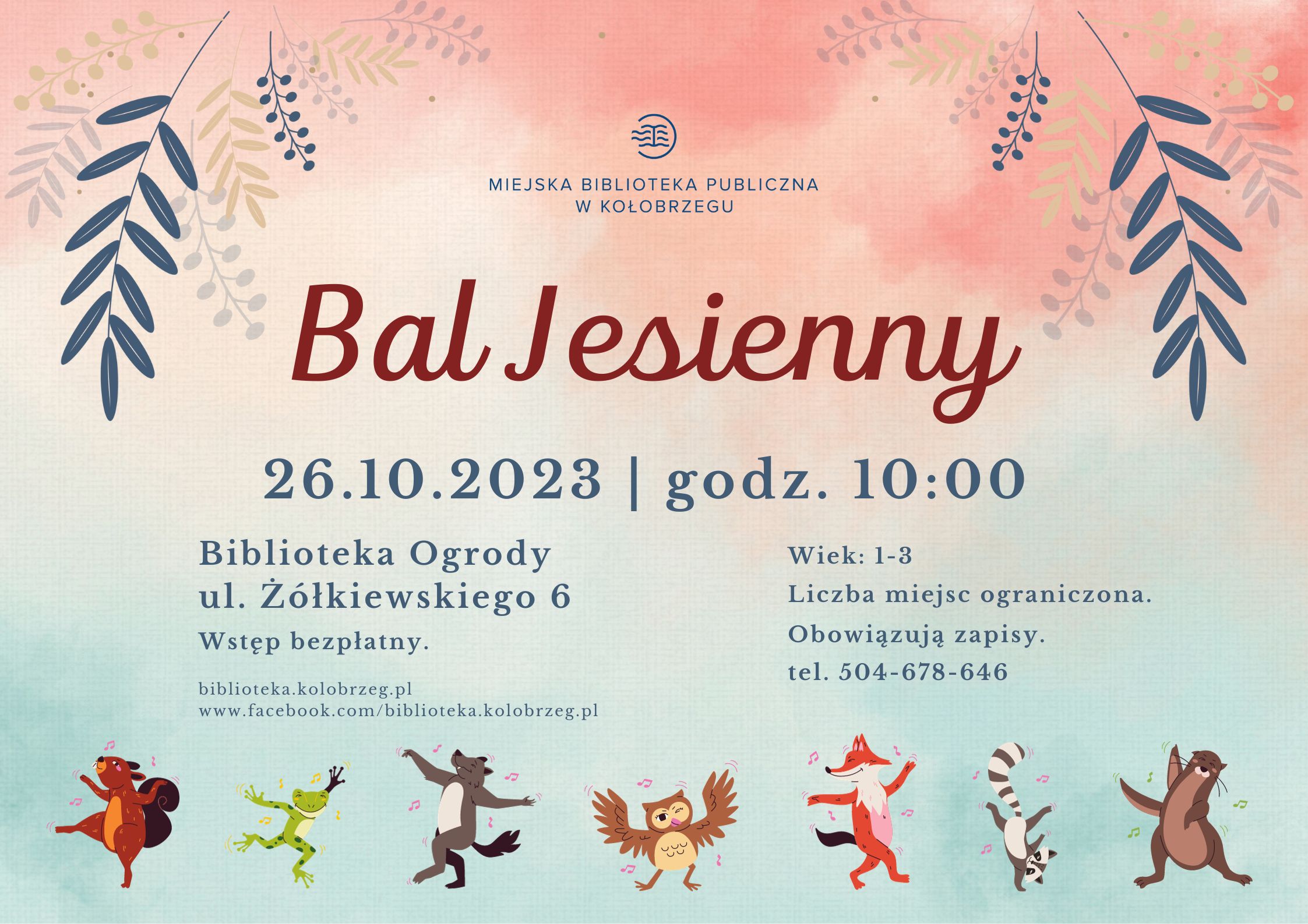 Zapraszamy w najbliższy czwartek 26.10.2023 o godzinie 10.00 naszych najmłodszych czytelników „MamyMalucha” (wiek:1-3) na Bal Jesienny. Mile widziane będą kolorowe jesienne przebrania i dodatki!